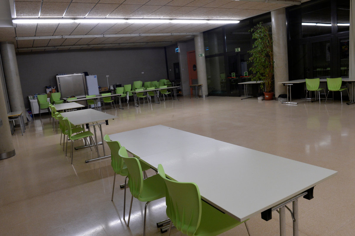 Empty tables are seen before the arrival of ballot boxes inside a polling station for the banned independence referendum in Vic, Spain, October 1, 2017. REUTERS/Vincent West