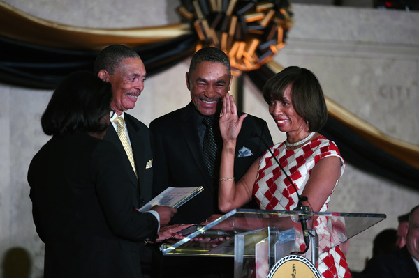 Court of Appeals Judge Shirley Watts administered the oath of office and Rep. Elijah Cummings introduced the new mayor.