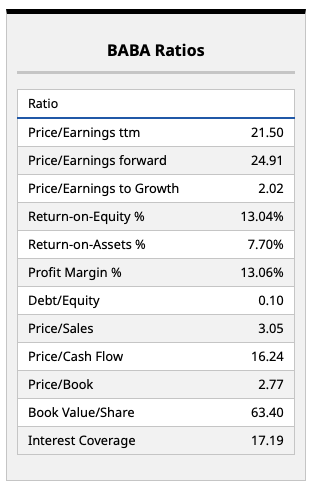 Well, looking at the company's valuation metrics above, it's pretty obvious that as far as tech companies worth more than $100 billion are concerned, Alibaba has to be one of the cheapest such stocks on any index. Trading at just 21 times trailing earnings, and considering the fact that Alibaba's forward multiple is higher than its trailing multiple, the market has priced in some growth slowdown in the stock.