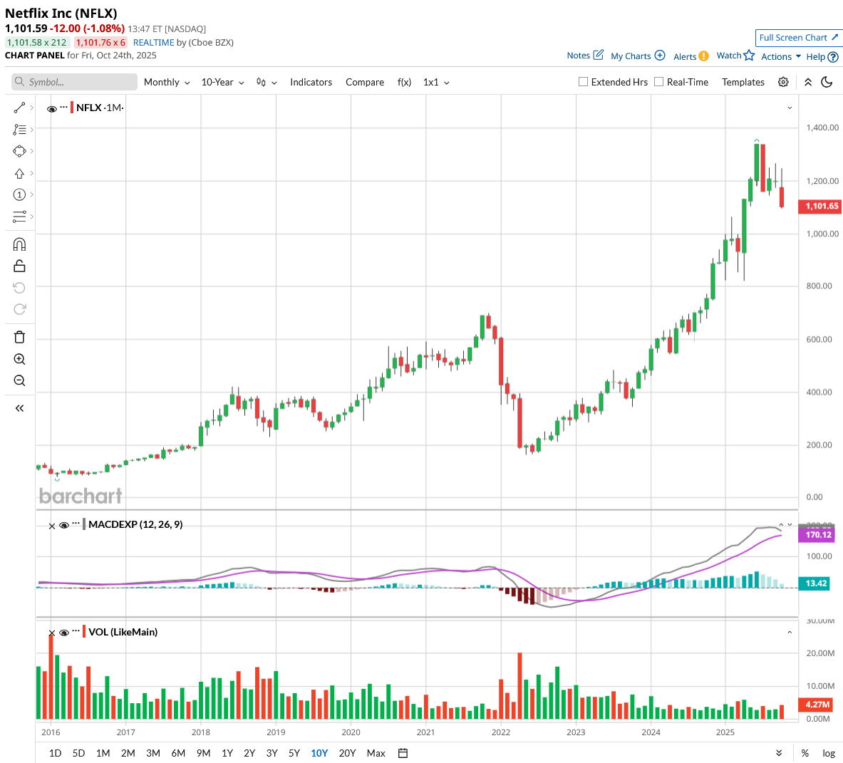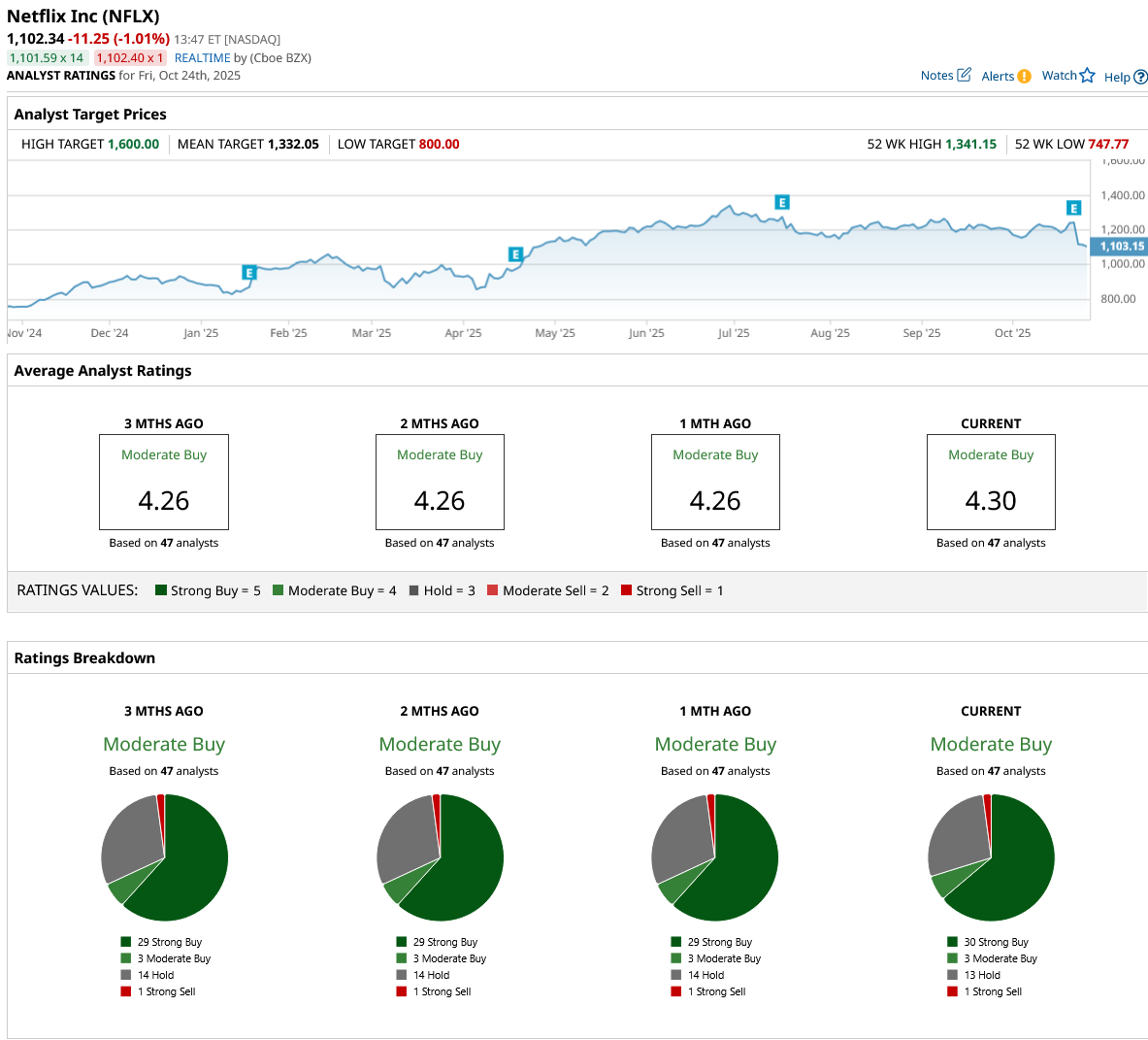Out of the 47 analysts covering NFLX stock, 30 recommend “Strong Buy,” three recommend “Moderate Buy,” 13 recommend “Hold,” and one recommends “Strong Sell.” The average NFLX stock price target is $1,332.05, above the current price of $1,102.34.