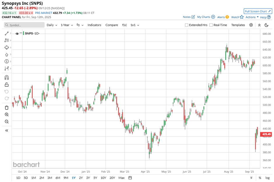 Synopsys released its Q3 fiscal 2025 results on Sept. 9. During the period, the company reported revenue of $1.7 billion, up 14% year-over-year (YOY). Non-GAAP earnings per share came in at $3.39, slightly down from $3.43 in the same period a year earlier and missing the consensus estimate.