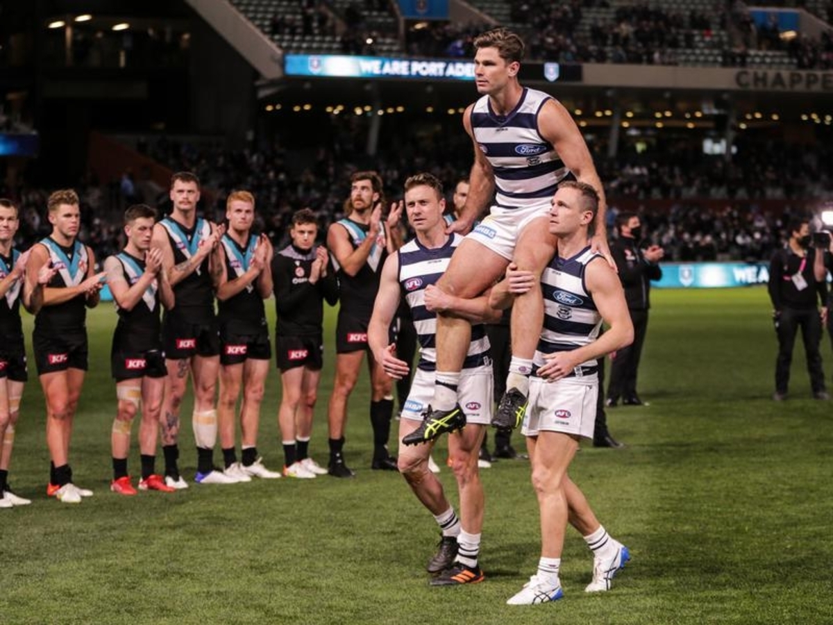 Milestone man Tom Hawkins kicked two goals in his 300th game as Geelong's only multiple goal kicker.