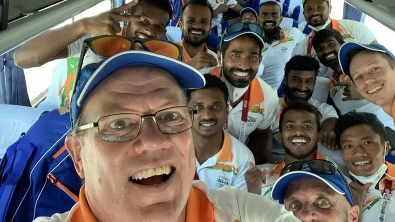 (Coach Graham Reid taking a selfie in the team bus after India won bronze at the Tokyo Olympics - Twitter Photo)