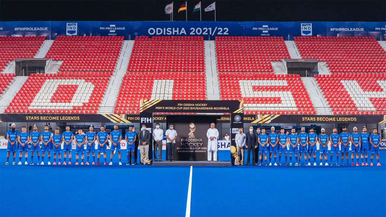 (India squad with Odisha CM Naveen Patnaik at the logo unveiling ceremony in build-up to the 2023 World Cup - HI Photo)