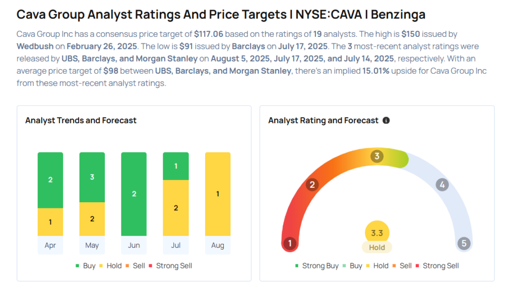 Analysts expect the Washington, District of Columbia-based company to report quarterly earnings at 13 cents per share, down from 17 cents per share in the year-ago period. CAVA Group projects to report quarterly revenue at $285.23 million, compared to $233.5 million a year earlier, according to data from Benzinga Pro.