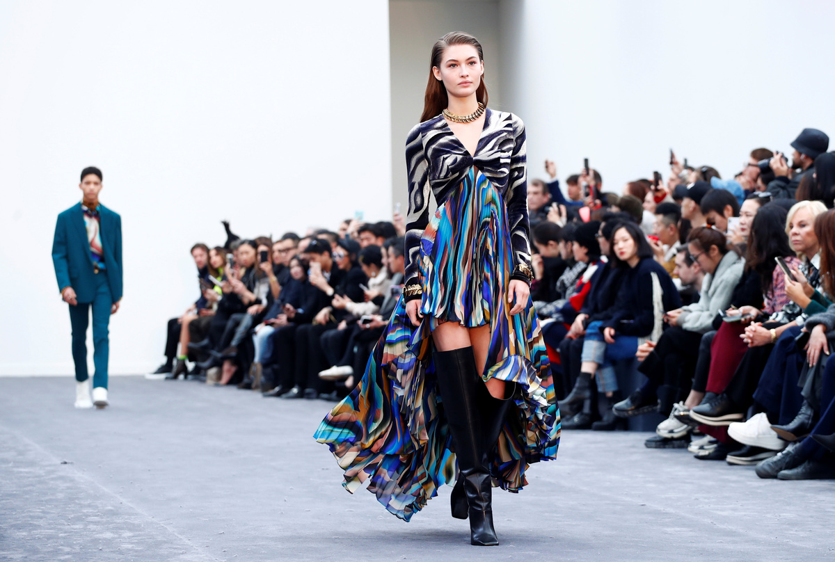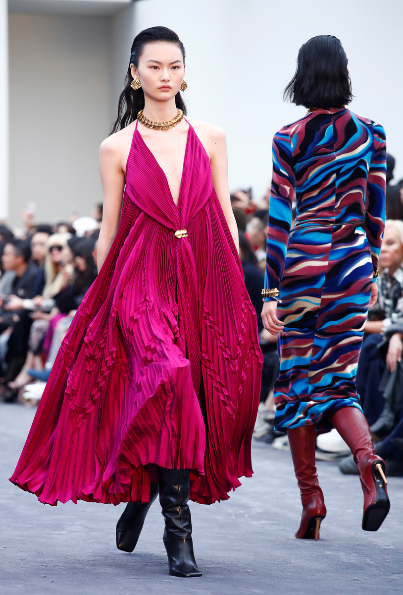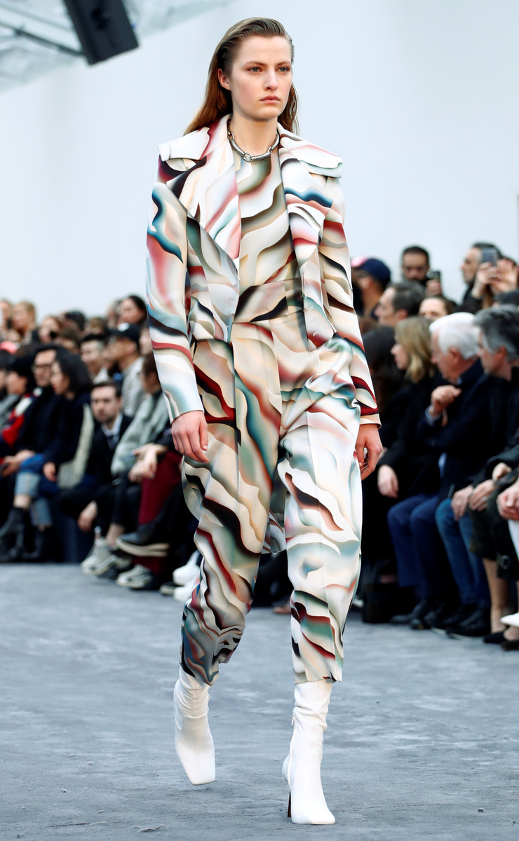 There were also frock coats, silk plisse pleated skirts, cut dresses, usually worn with thigh-high heeled boots or mules. Women's trouser suits had high waists and arrived above the ankle. The color palette included purple, blue, orange and pink, namely on the wavy patterns, as well as porcelain and chartreuse.