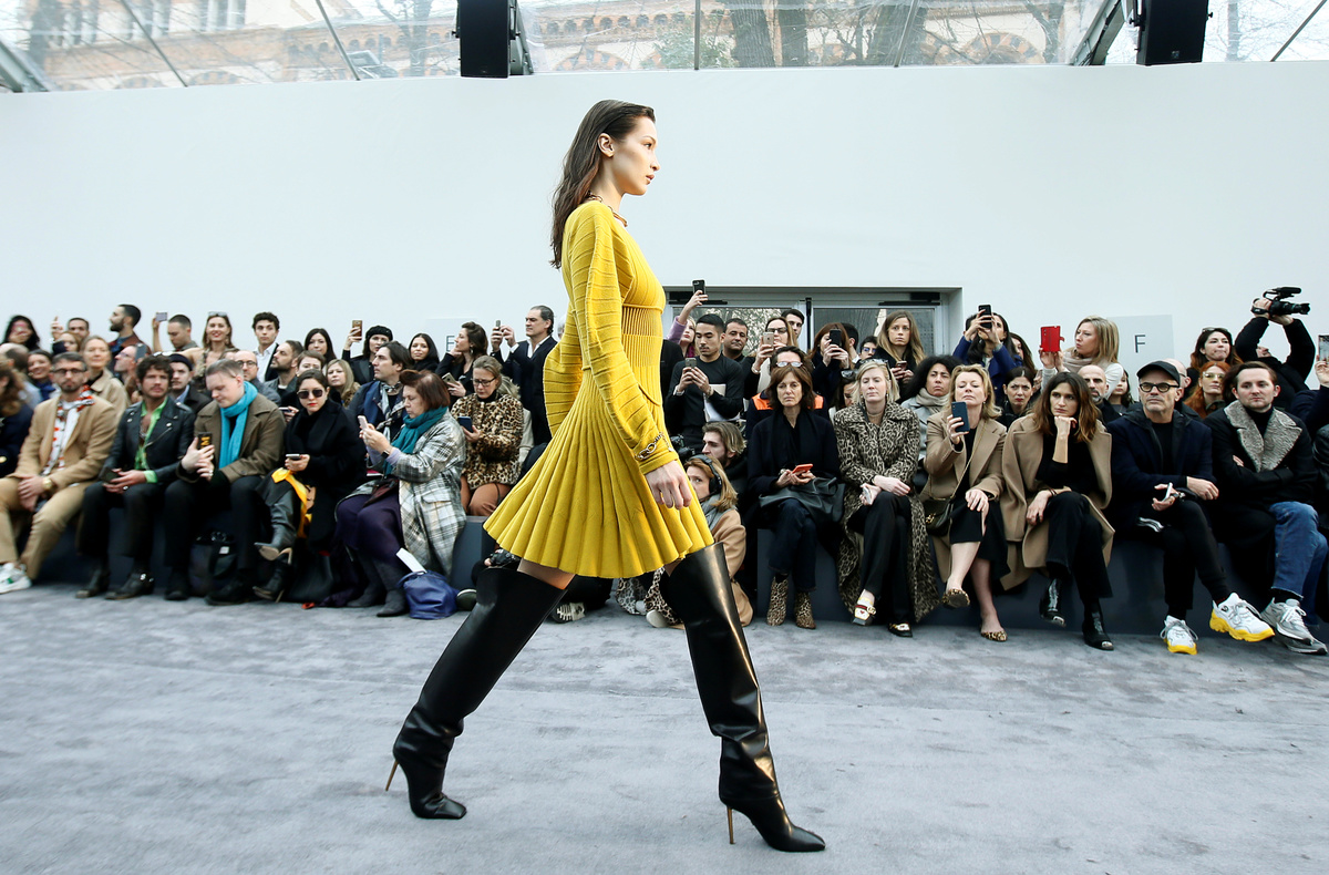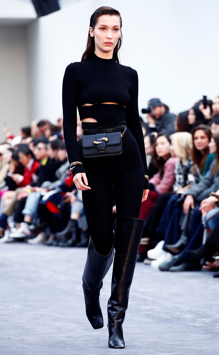 Model Bella Hadid, who has walked some of the biggest shows during Milan Fashion week, strutted down the catwalk in a mustard ribbed dress with a pleated skirt, before changing into an all-black ensemble with cuts.