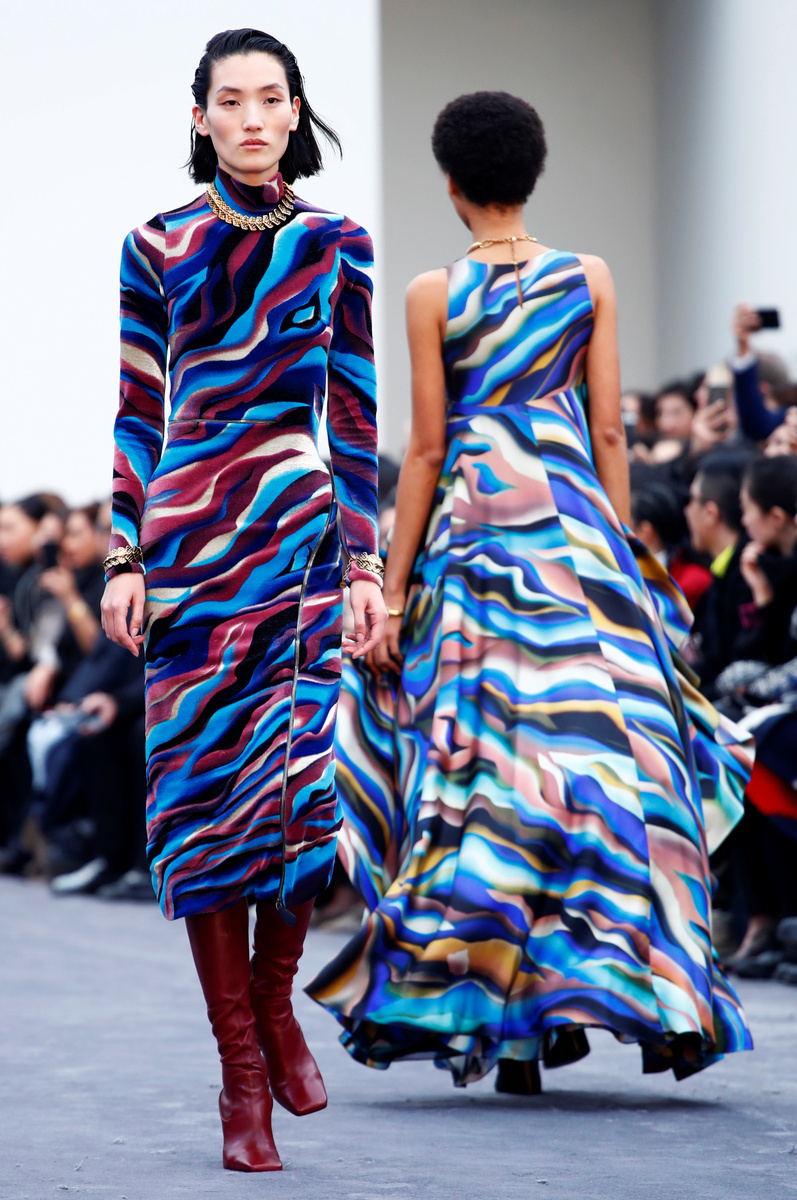 The brand, founded by Roberto Cavalli in the early 1970s, is known for use of animal prints and Surridge delivered "modernist tiger print", a wavy version of the pattern, on tops, silk dresses and as shiny embroidery on other frocks.