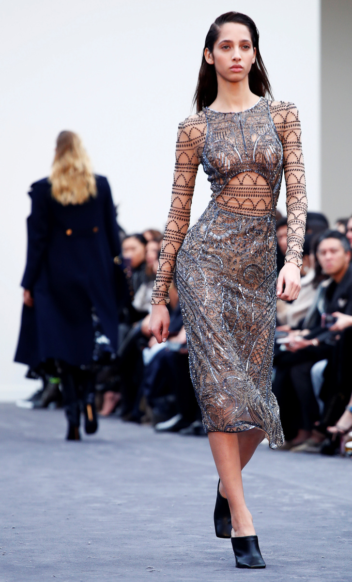 Surridge also presented plenty of shiny metallics, namely on evening tops and frocks - studded mini-dresses and tiered gowns - as well as slim-fitted trousers. Inspired by Art Deco, intricately embroidered evening dresses looked to 1920s fashion.