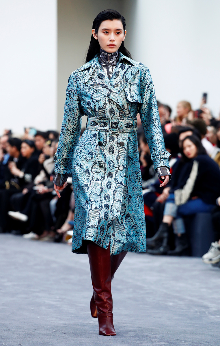 Python patterns were seen on jacquard or sequined outfits, namely in a mix of pale blue and black.