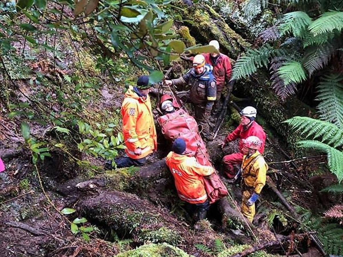Police say the 62-year-old Ulverstone man was caving with three friends near Mount Cripps on Saturday when he fell off a ladder inside the narrow cave system and hurt his back, leaving him unable to climb out.