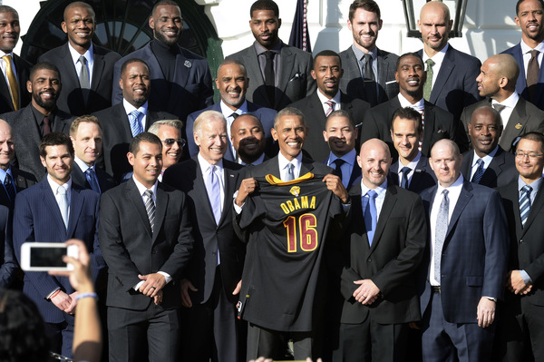 Kevin Love concluded the ceremony by presenting the president with a No. 16 Cavs jersey with "Obama" stitched across the back.