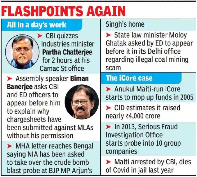 KOLKATA: The CBI on Monday questioned senior Bengal minister Partha Chatterjee for two hours in the iCore case, the development setting off a chain of events that saw central agencies re-emerging as flashpoints in the rocky Bengal government-Centre relationship.