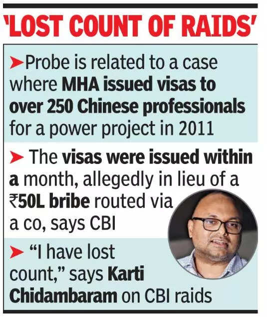 NEW DELHI: The CBI has filed an FIR against Congress MP Karti Chidambaram and four others and conducted nationwide raids on his properties in connection with its probe in a case where the ministry of home affairs issued visas to over 250 Chinese professionals, working at a power project in Punjab.