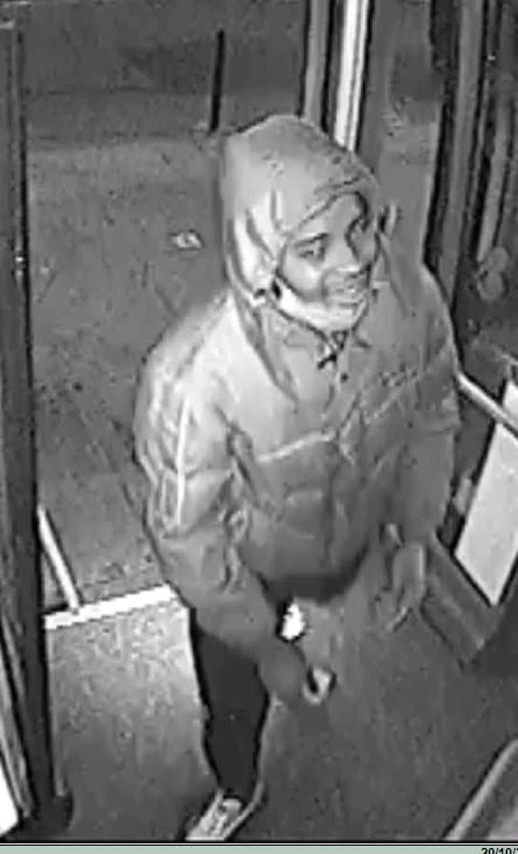 The man can be seen in a doorway, clad in a jacket with the hood up and a mask covering part of his chin.