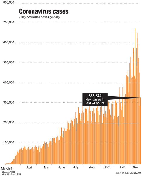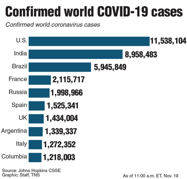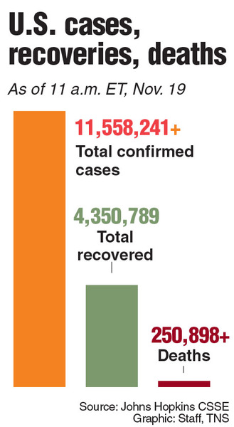 That cautionary tone, though, comes after many Americans have already made their plans and are on the verge of traveling. Entering the U.S. holiday season, the nation is experiencing its worst surge of the virus yet. Cases are spiking nationally to record levels. The U.S. recorded 148,000 new cases on Tuesday after hitting a record daily total of 190,000 on Nov. 13. U.S. deaths from the coronavirus have surpassed 250,000, including 1,425 on Tuesday. Hospitalizations are at a record level.