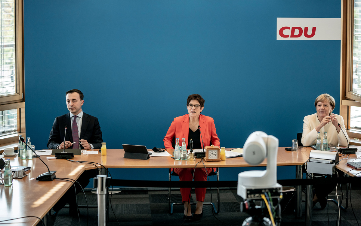 FILE PHOTO: German Chancellor Angela Merkel, Annegret Kramp-Karrenbauer, leader of Germany's conservative Christian Democratic Union (CDU) and secretary general Paul Ziemiak attend a party leadership meeting in Berlin, Germany, September 14, 2020. Michael Kappeler/POOL via REUTERS
