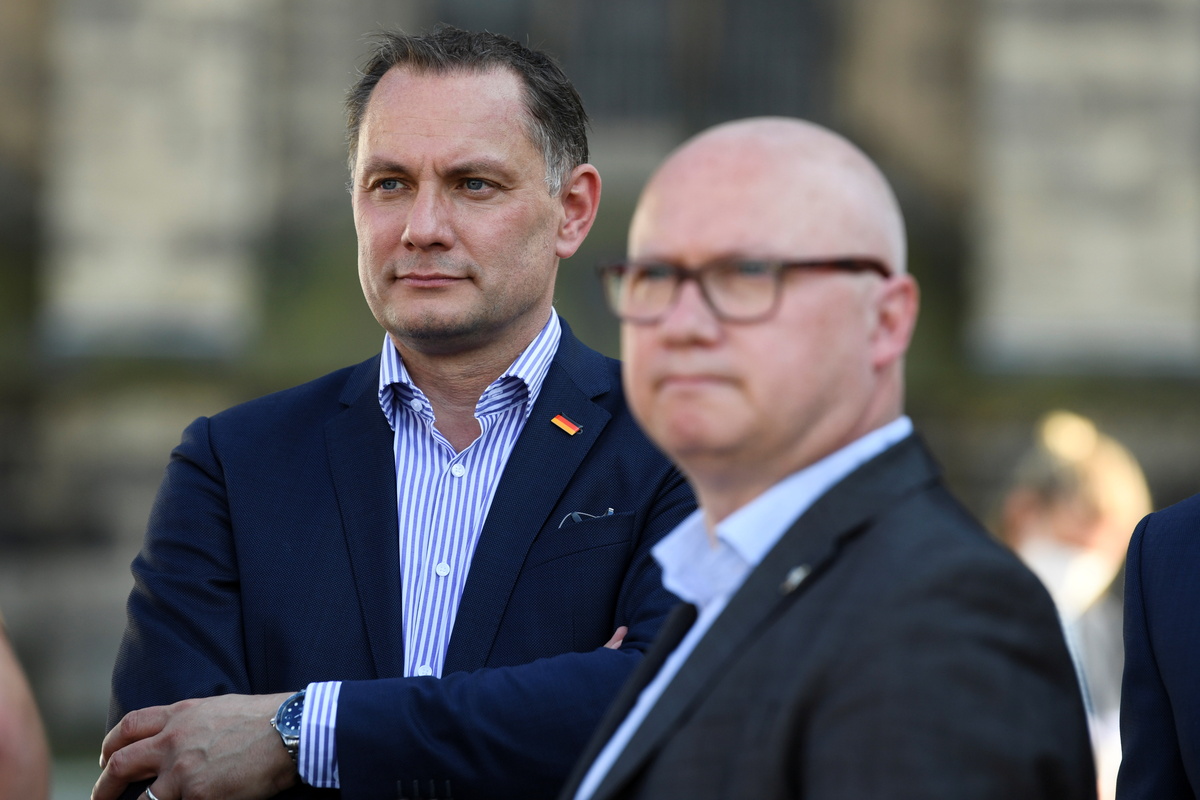 AfD's federal spokesman Tino Chrupalla and AfD's top candidate Oliver Kirchner attend the final election campaign rally of the far-right Alternative for Germany (AfD) party ahead of the Saxony-Anhalt state election at the Domplatz in Magdeburg, Germany June 4, 2021. REUTERS/Annegret Hilse