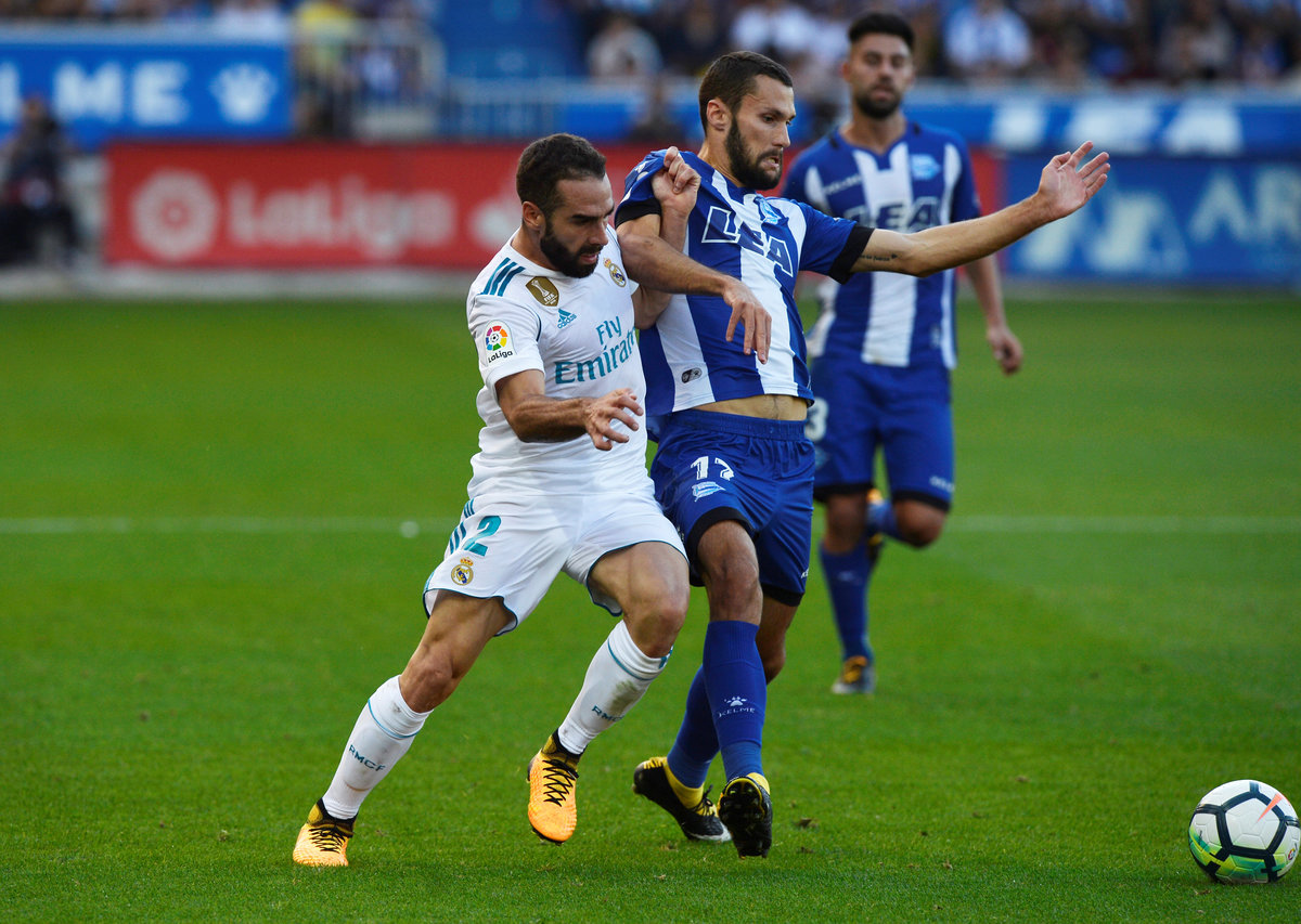 Soccer Football - Santander La Liga - Deportivo Alaves vs Real Madrid - Mendizorrotza Stadium, Vitoria-Gasteiz, Spain - September 23, 2017 Real Madrid’s Dani Carvajal in action with Alaves’ Alfonso Pedraza REUTERS/Vincent West