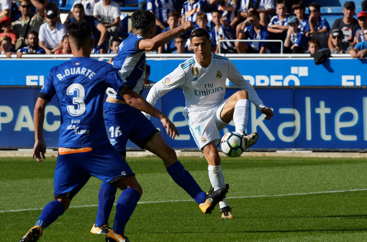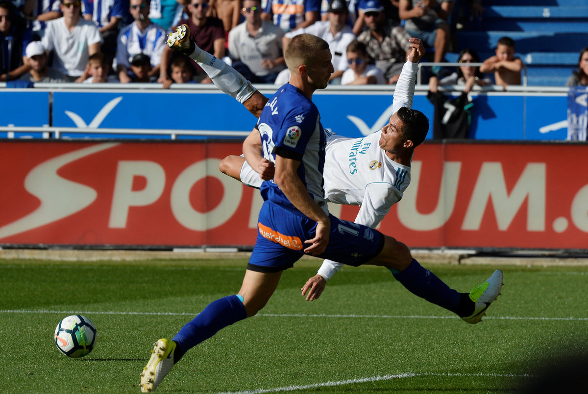 Soccer Football - Santander La Liga - Deportivo Alaves vs Real Madrid - Mendizorrotza Stadium, Vitoria-Gasteiz, Spain - September 23, 2017 Real Madrid’s Cristiano Ronaldo in action with Alaves’ Daniel Torres REUTERS/Vincent West