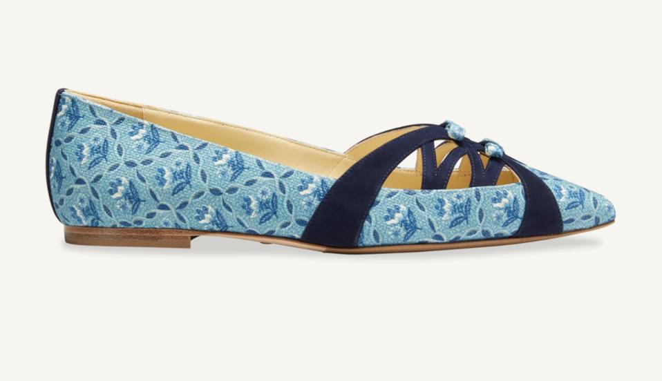 "Much of the collection was inspired by the boutique hotel La Mirande, which is centuries old and beautifully decorated with luxurious textiles and antiques," Flint told me. "Many of their rooms feature Pierre Frey fabrics, which led me to incorporate Pierre Frey prints on our new limited-edition styles. I also drew from the hotel's ornate cornice work and filigree detailing, which you'll see pop up on shoes debuting later in the season."