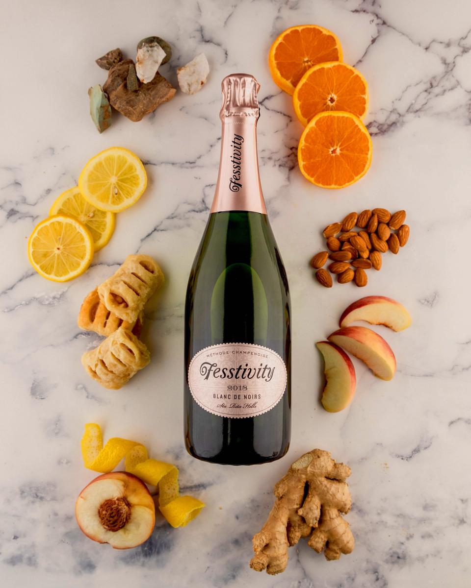 Fesstivity Blanc De Noirs, 2018: This wine has a creamy mouthfeel with notes of buttery brioche, wild strawberry, orange and lemon peel. It has a brisk freshness, slight pink hue and is 100% barrel aged for seven months in neutral French oak barrels, with 19 months on the lees. A beautifully made sparkling wine, mostly pinot noir with a touch of chardonnay. Excellence at a nice price from the Fess Parker team.