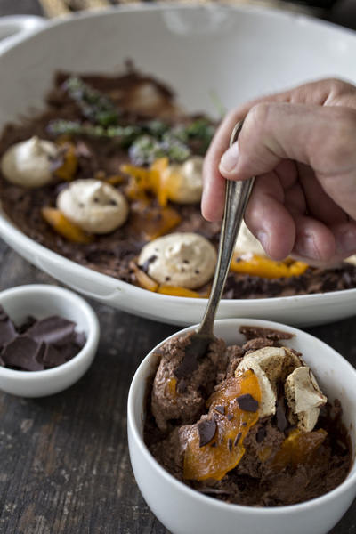 Assembly: Transfer chocolate mousse to a large serving bowl and top with meringue cookies and fresh persimmons. If persimmons are slightly underripened, sprinkle with a little sugar and salt to bring out the natural flavors.