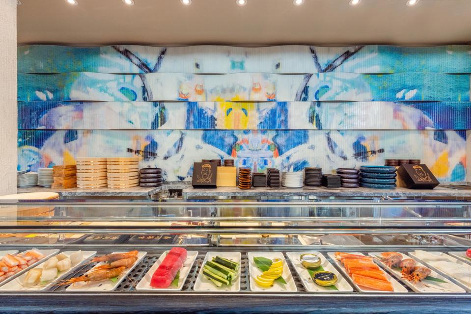 The main dining area, designed by Celano Design Studios, is clad with undulating teak panels and is anchored by three curved wood trellis structures. The semi-open kitchen features sushi and robata grill dining counters. Artworks of Back’s mother Young-Hee Back are fashioned onto the wall tiles, sofa fabrics and plates. “All my restaurants have my mom’s art,” he shares. “It’s a signature element.” Back adds that they just built their dream family home together in Las Vegas, where he has been based for the last 15 years, since he opened his first restaurant, Yellowtail Japanese Restaurant and Lounge.