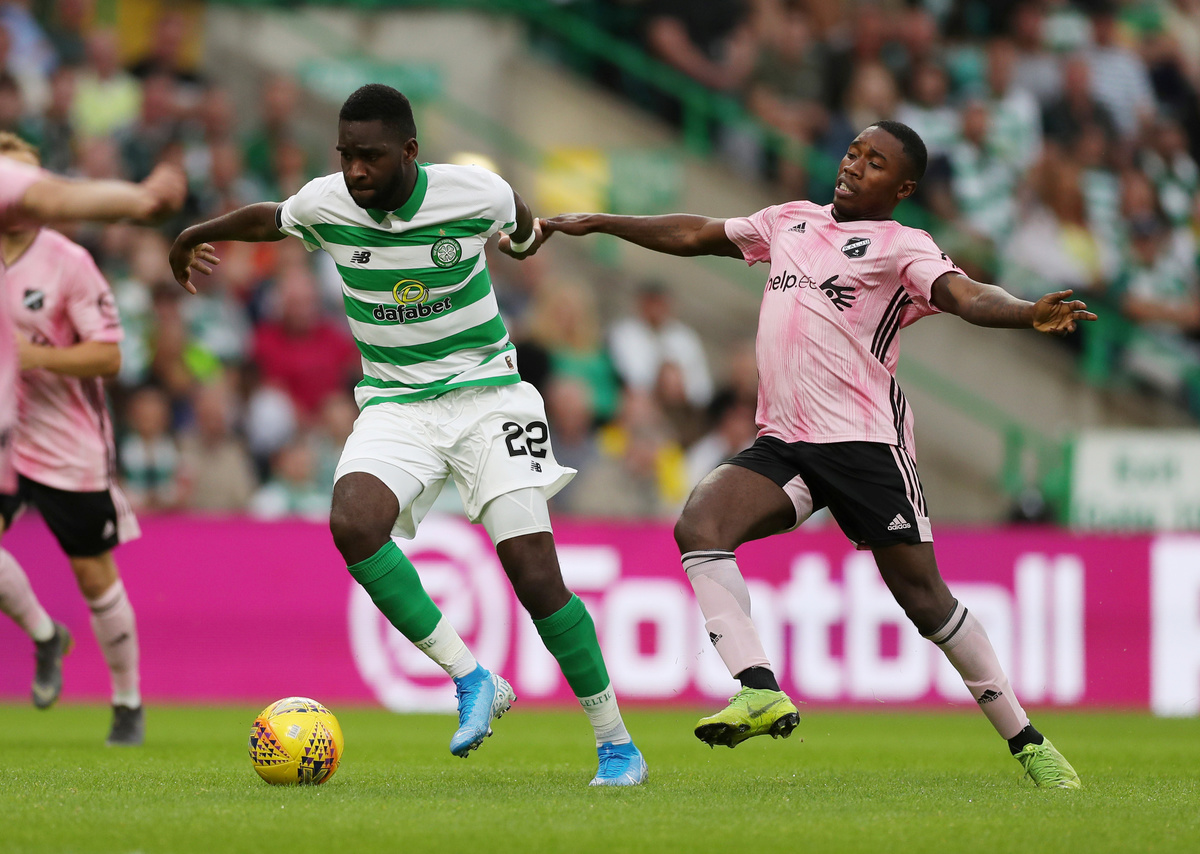 Soccer Football - Champions League - Second Qualifying Round First Leg - Celtic v Nomme Kalju - Celtic Park, Glasgow, Britain - July 24, 2019 Celtic's Odsonne Edouard in action with Nomme Kalju's Reginald Mbu Alidor Action Images via Reuters/Lee Smith