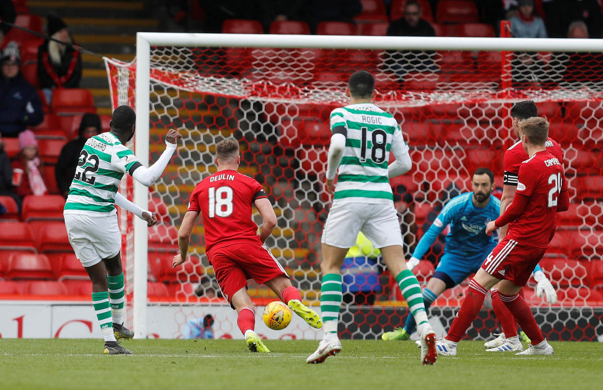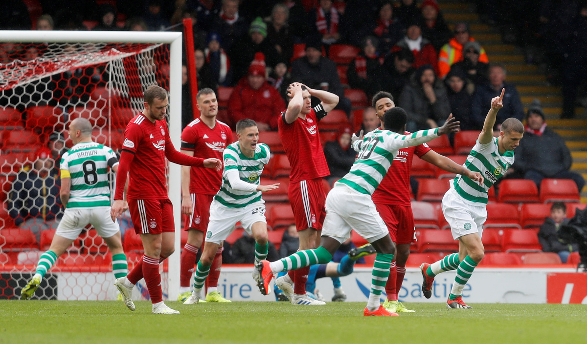 An angled cross from midfielder Callum McGregor was met by right back Mikael Lustig, who sent a diving header past Aberdeen goalkeeper Joe Lewis.