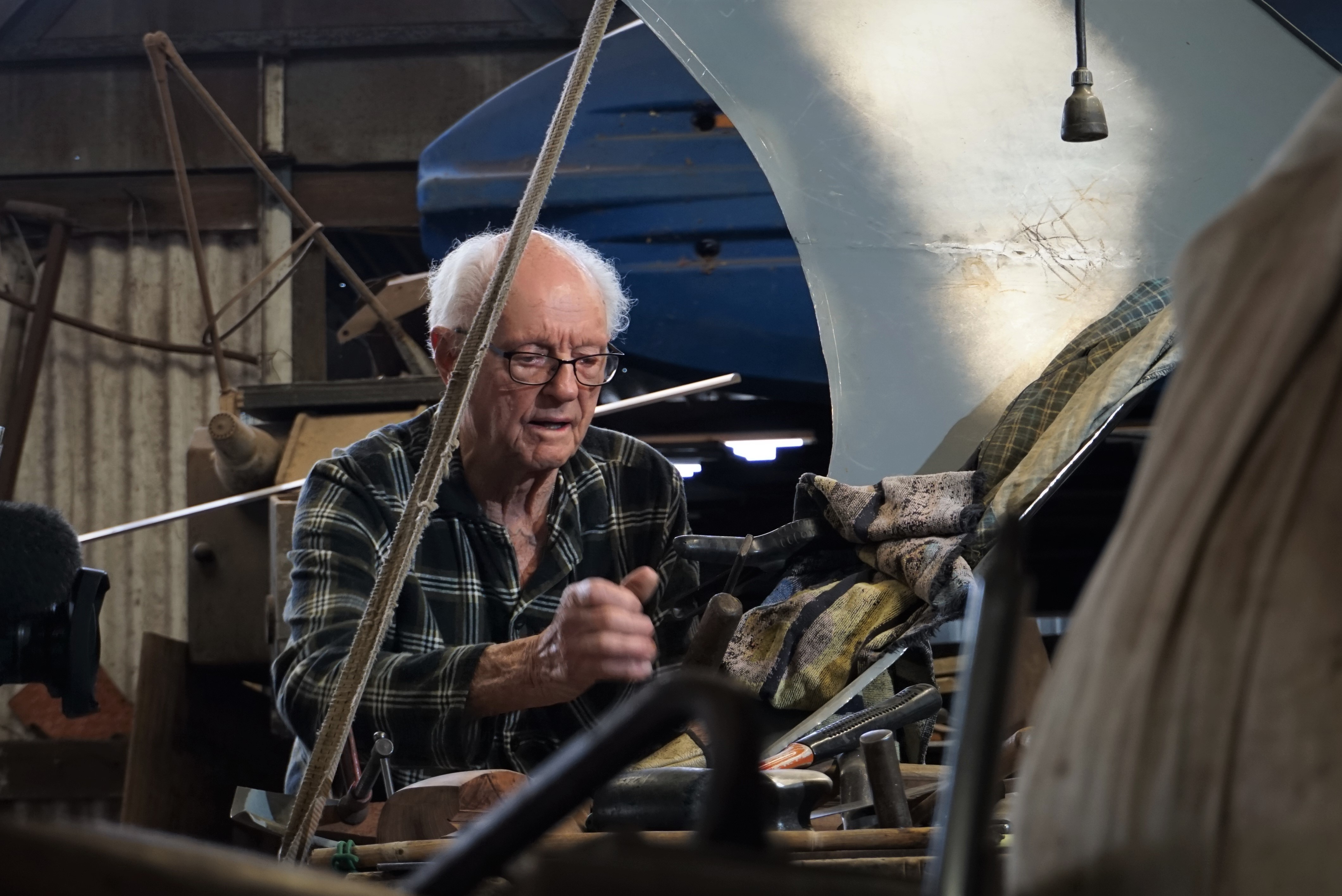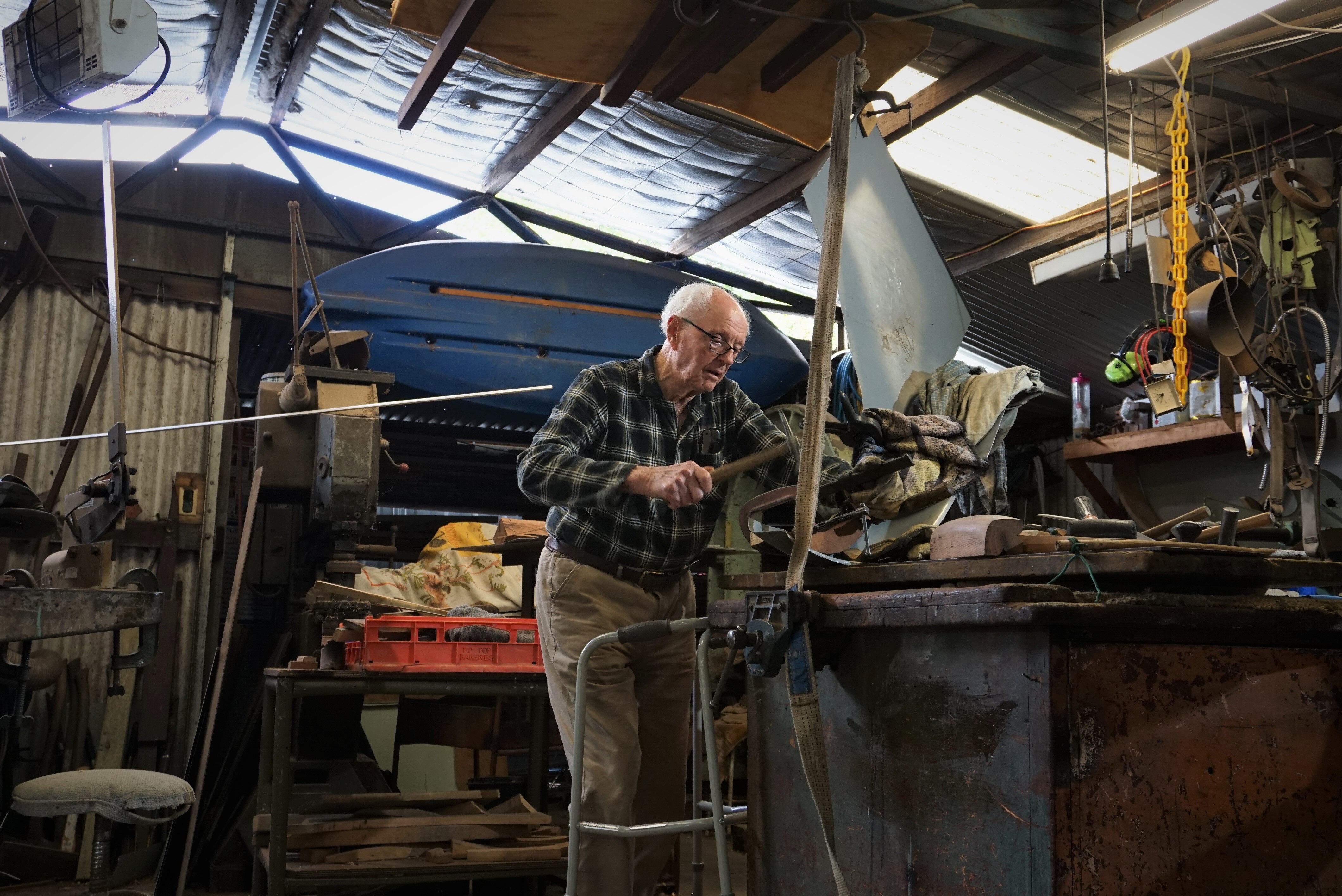 The scraping of his walking frame against the concrete floor blends with the banging of his hammer bending thick aluminium.