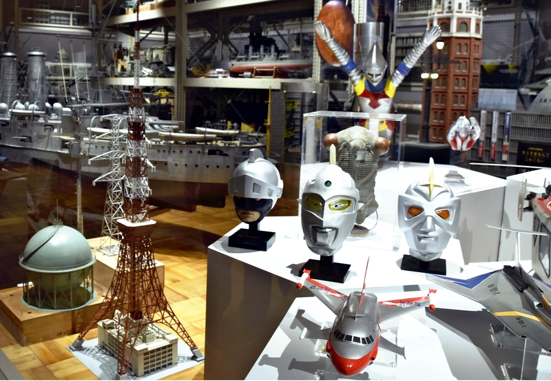 On display at the center are about 1,000 items used in shooting scenes in science fiction films, including the masks of many special effects heroes such as those used in the "Ultraman" series, models of the Yamato battleship and miniature sets that reproduced townscapes. Visitors enjoyed viewing and photographing the displays.
