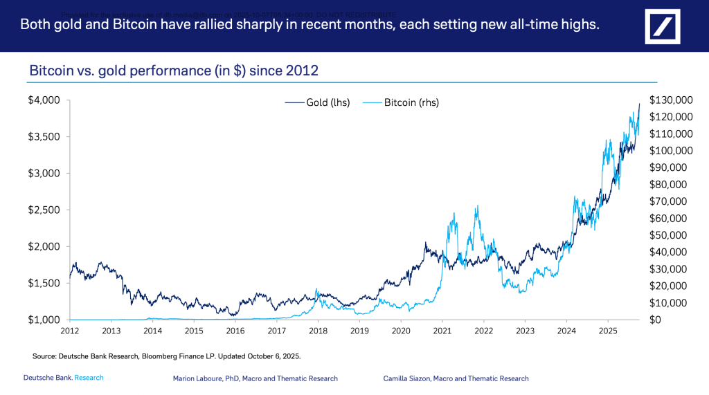 - Deutsche Bank predicts Bitcoin could be added to central bank reserves by 2030 as its volatility falls and its behavior resembles gold, despite not being “backed by anything.” Recent surges in gold and Bitcoin, driven by central banks seeking diversification and companies creating Bitcoin “treasuries,” show Bitcoin’s growing appeal as a safe-haven asset.