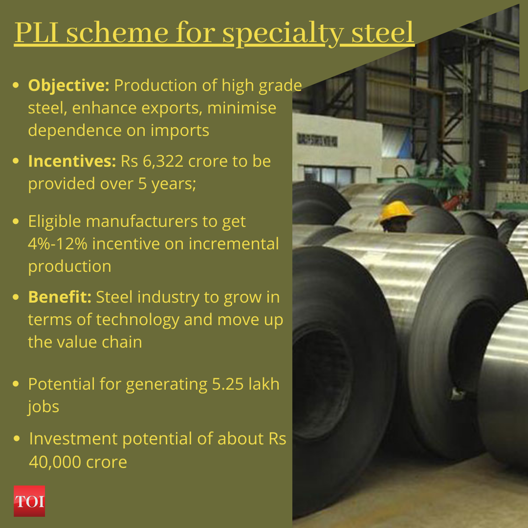 NEW DELHI: The Union Cabinet on Thursday approved the production-linked incentive (PLI) scheme for specialty steel to boost production of high grade steel in the country.