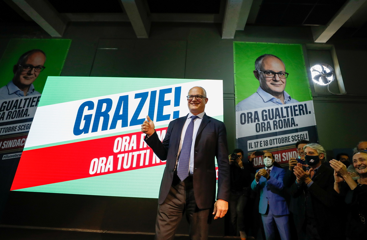 In Rome, former Economy Minister Roberto Gualtieri from the Democratic Party (PD), was projected to win by 60% to 40% against the right's Enrico Michetti, an impregnable lead with the count still underway.