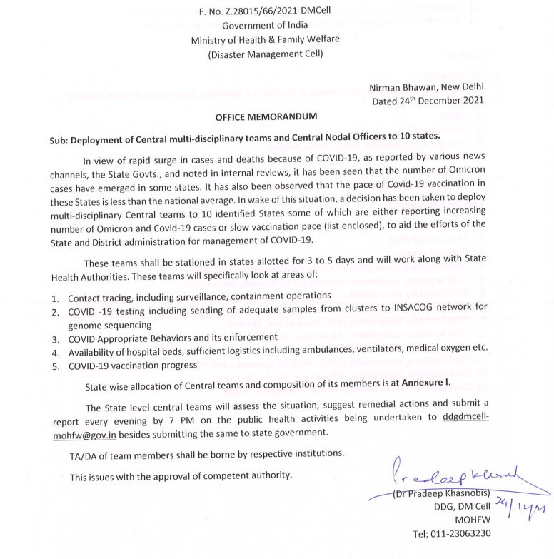 "It has also been observed that the pace of Covid-19 vaccination in these states is less than the national average. In wake of this situation, a decision has been taken to deploy multi-disciplinary central teams to 10 identified states some of which are either reporting increasing number of Omicron and Covid-19 cases or slow vaccination pace (list enclosed), to aid the efforts of the state and district administration for management of Covid-19," the memorandum stated.