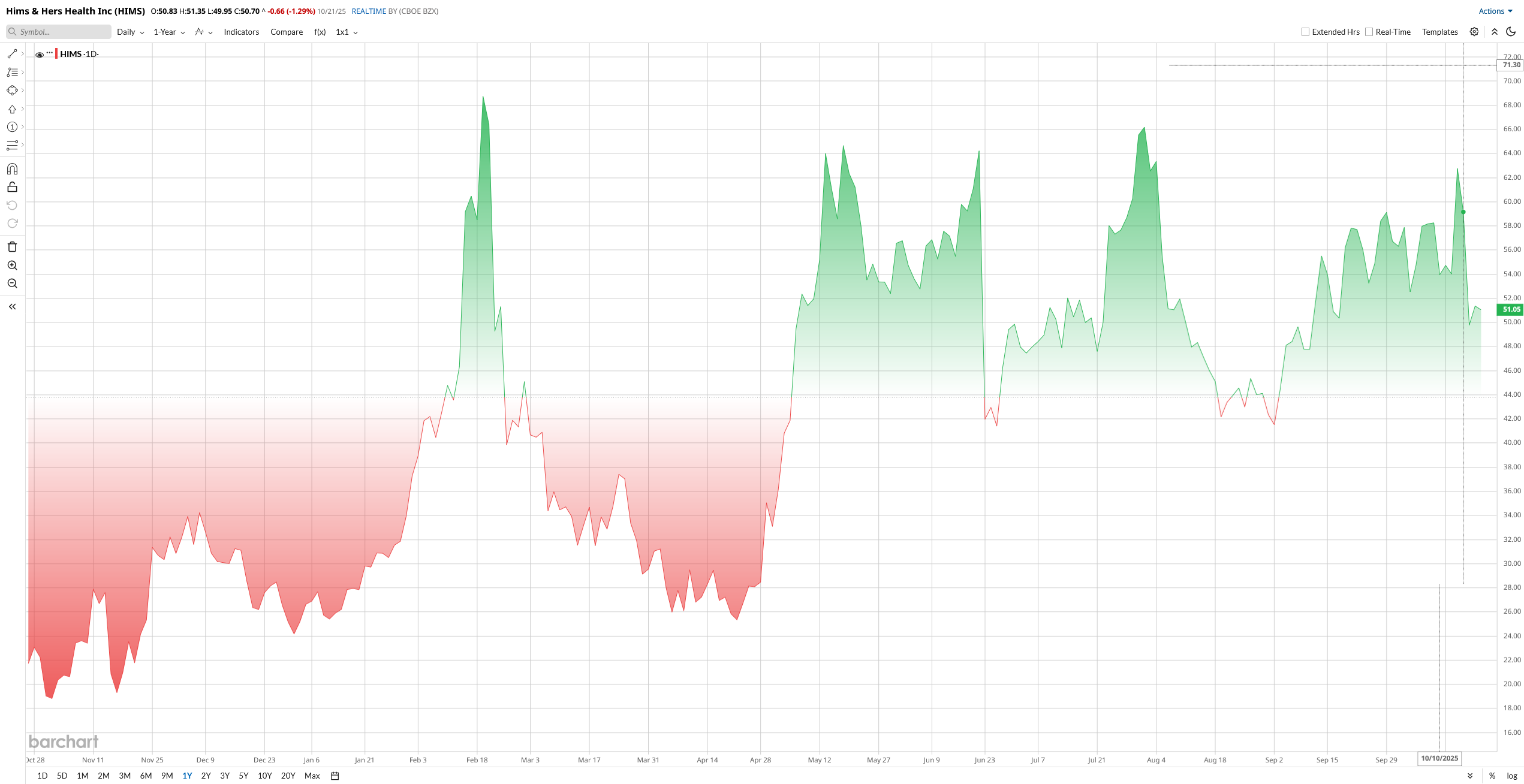 Hims & Hers has been one of 2025’s best performers. HIMS has surged triple-digit growth, gaining 109% year-to-date (YTD). The surge is driven mainly by internal momentum, stronger execution, and product expansion. Plus, in mid-October, for example, announcing its expanded women’s health offerings ignited a double-digit rally that pushed HIMS’s market cap to about $11 billion.