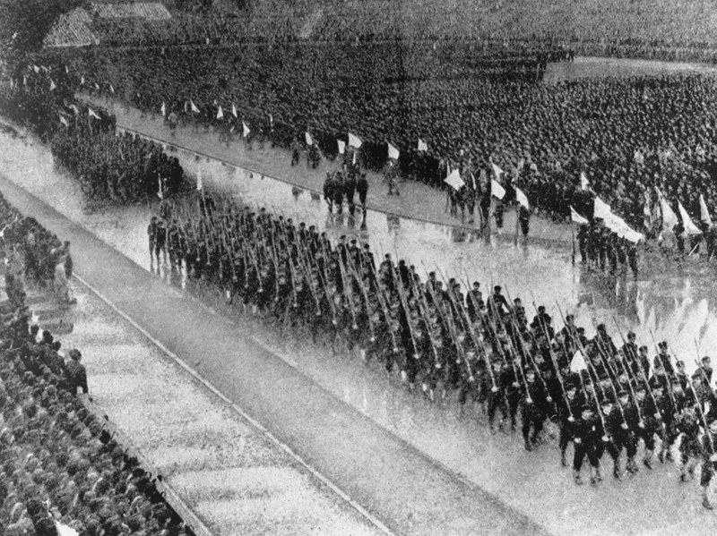 The departure ceremony for the university students was held for the first time by the then Education Ministry on Oct. 21, 1943. The ceremony was aimed at encouraging those students who were to be enlisted, due to the suspension of the exemption from military service. More than 20,000 students enrolled at 77 universities are said to have taken part in that departure ceremony, with students clad in school uniforms marching on the track in the rain, carrying a gun on their shoulder.