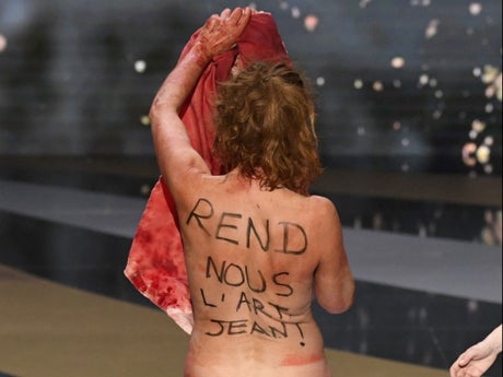 Masiero then stripped naked on stage, revealing the words “no culture, no future” on her torso in French.
