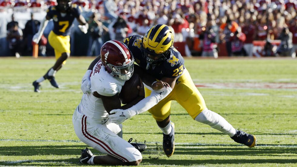 Either way, it’s too good a matchup to let Harbaugh’s future overshadow the on-field story lines. Michigan’s defense — which sacked Alabama six times and had 10 tackles for loss in a devastating semifinal performance — is the best in the country. Washington’s passing attack, from Michael Penix Jr.’s pinpoint accuracy to Rome Odunze’s elite route running and Ja’Lynn Polk’s and Jalen McMillan’s game-breaking ability, is state of the art. But the Huskies can sling some “D” themselves, as they’ve displayed in the fourth quarters of one close game after another all season. And the Wolverines have NFL talent all over their offense, with skill guys J.J. McCarthy, Blake Corum, Roman Wilson and others plenty capable of stealing the Huskies’ thunder.