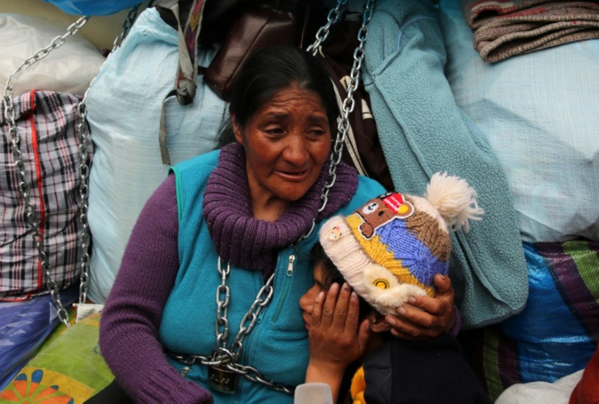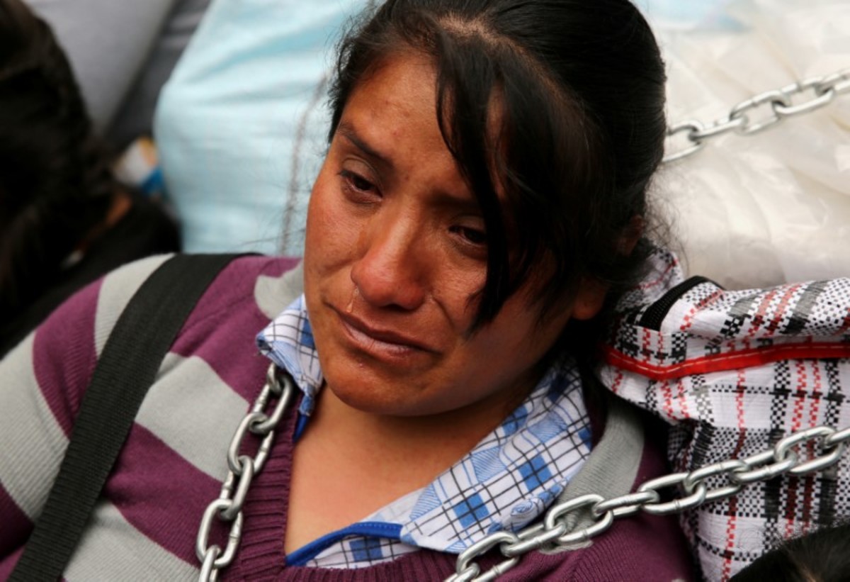 Yolanda Macarisantos holds her son David, as she chains herself outside of the health ministry to protest for what they describe as rampant pollution from a sprawling polymetallic mine operated by Peruvian mining company Volcan, in Lima, Peru June 22, 2017. REUTERS/Mariana Bazo