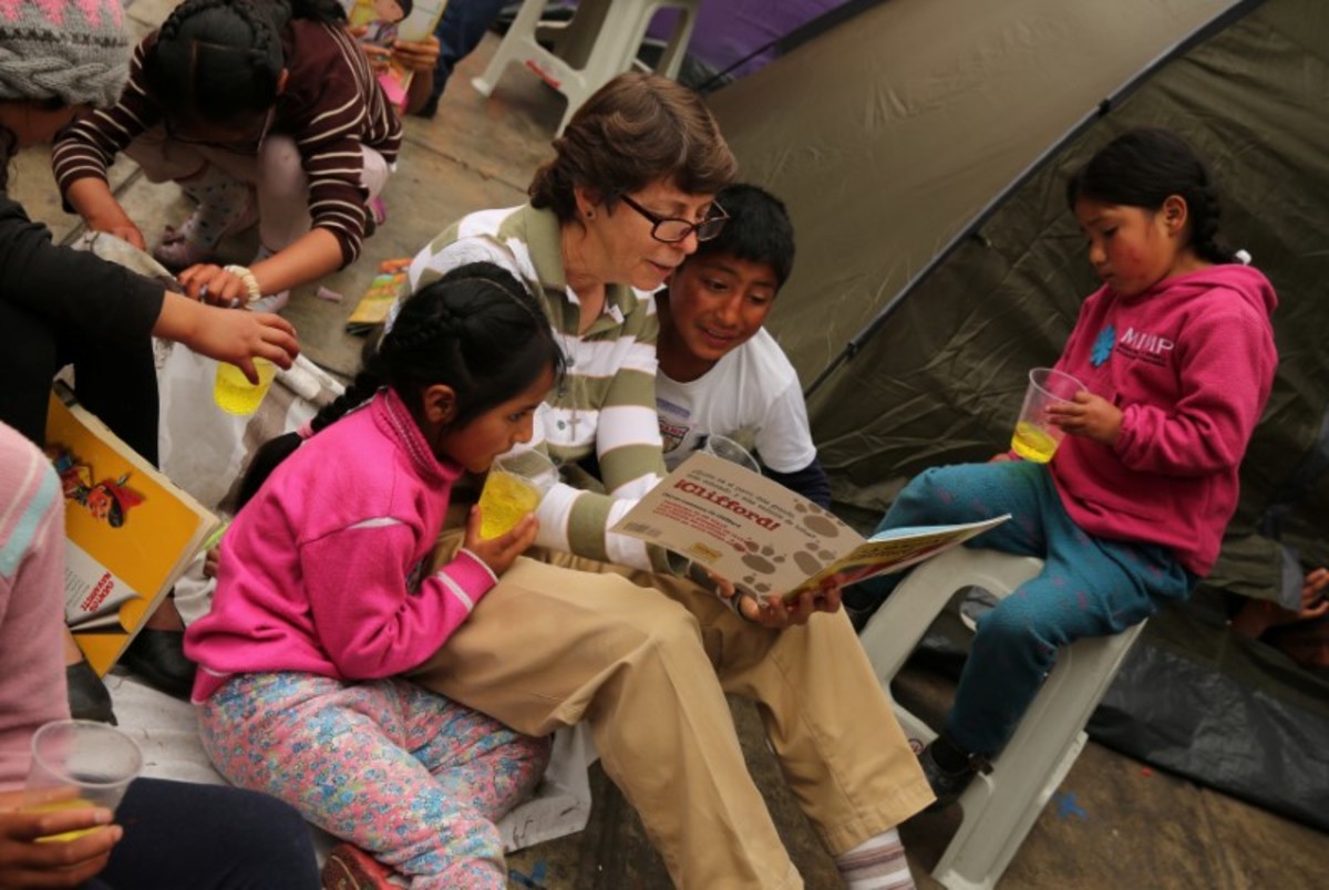 Sister Anne Davis reads books to childs outside the health ministry where residents of the town Cerro de Pasco are protesting what they describe as rampant pollution from a sprawling polymetallic mine operated by Peruvian miner Volcan, in Lima, Peru, June 22, 2017. REUTERS/Mariana Bazo