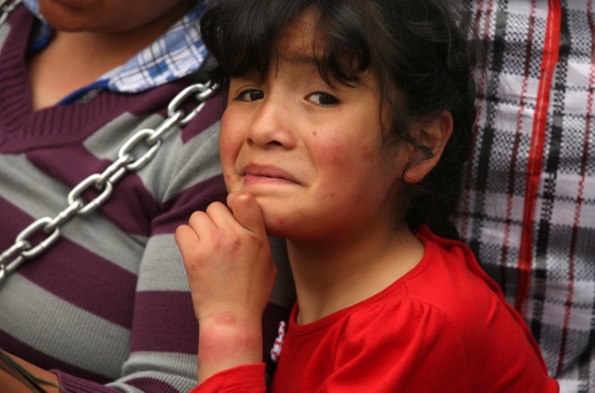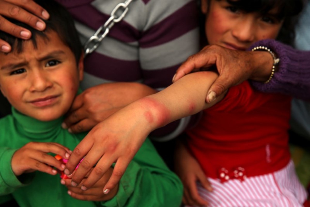 "As a mother it's so painful to see my daughter suffer," said Sarita Custodio, crying and pointing to rashes on her daughter's face and arms face as she sat chained to the entrance of the health ministry with other parents. "The doctor said it's because of the lead."