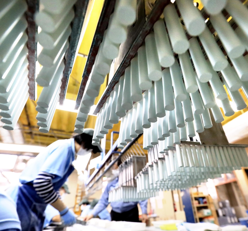 At this time of the year, when orders from schools and other facilities increase, the factory can turn out over 200,000 pieces of chalk every day. The production peak is expected to continue through the end of this month. This year, about 40 million pieces are scheduled to be shipped not only across the nation but also to other countries such as the United States, China and South Korea.
