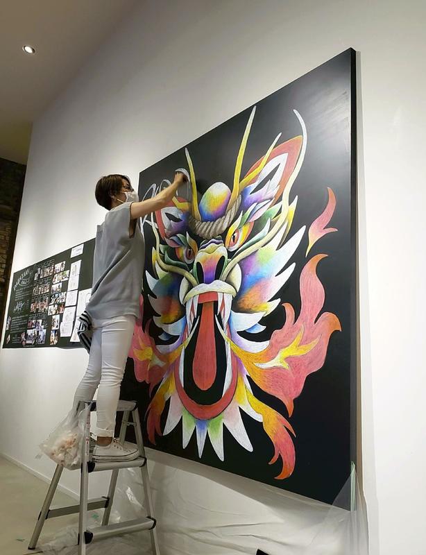 OMUTA, Fukuoka -- A brightly colored mythical serpent-shaped festival float is drawn in chalk at a cafe in Omuta, Fukuoka Prefecture, as the local festival featuring these giant serpent floats has been postponed until next year.