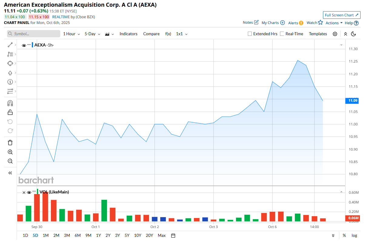 American Exceptionalism Acquisition Corp. launched AEXA stock on Sept. 26 with an initial public offering of 30 million shares valued at $10, plus an additional 4.5 million shares issued following the exercise of underwriters’ over-allotment option. That values the company at $345 million.