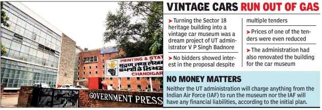 The administration had spent a significant amount to renovate the building for the vintage car museum. “Since it is a heritage building, the engineering department of the UT had to take precautions while carrying out the work to ensure there were no changes in the original structure,” sources said, adding as the building is situated at the one of the most prime locations in the city, its regular protection is a major challenge for the UT.