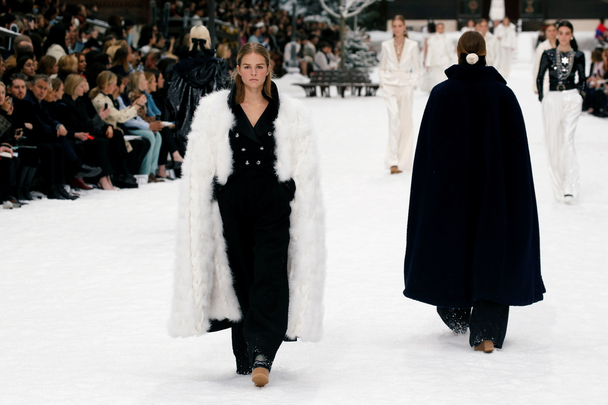 Actress Penelope Cruz, one of the faces of the brand, took to the snowy runway in a white, feathery puffball dress, followed by 17-year-old teen supermodel Kaia Gerber, who collaborated with Lagerfeld on designs for his eponymous brand.