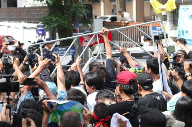 There was chaos in front of Samran Rat police station in Bangkok on Friday morning as anti-government activists arrived to acknowledge charges stemming from a rally on July 18.