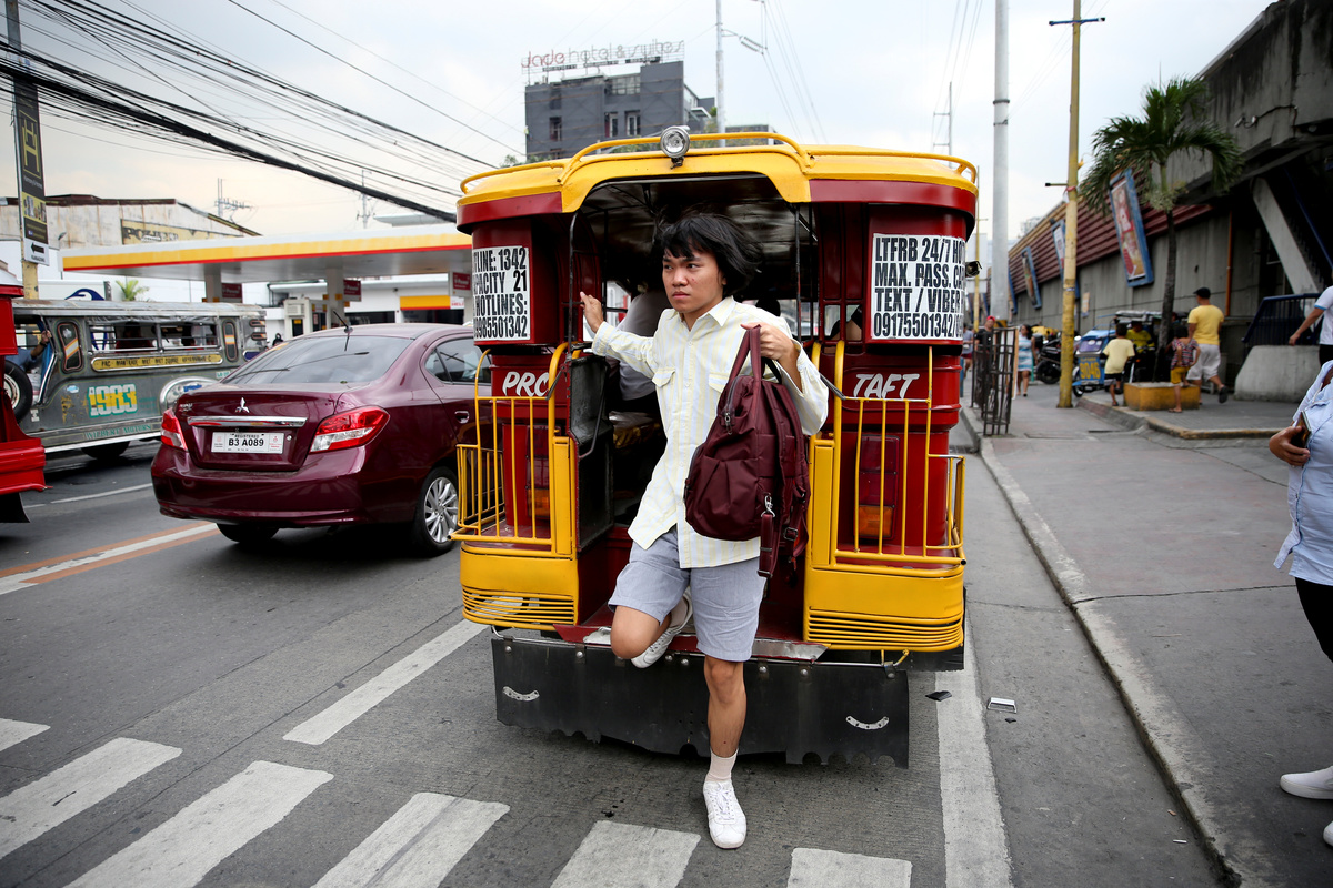 Oliver Emocling, 23, who works for a magazine, gets off a jeepney near his office in Makati City, Philippines, November 29, 2018. "When I get home, it's already 10 p.m.," said Emocling, who works at a magazine. "I could be using that time to sleep more, rest more. Instead, my time gets wasted". REUTERS/Eloisa Lopez